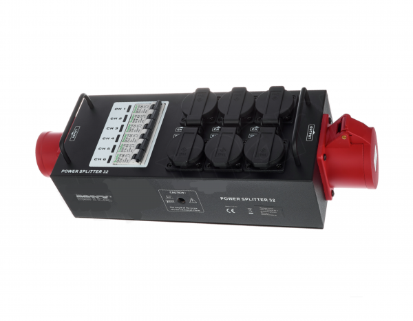 1 In CETAC 32a trifásico (Fase, Neutro y Tierra certificado CE) y 6 salidas schuko (2 por fase).